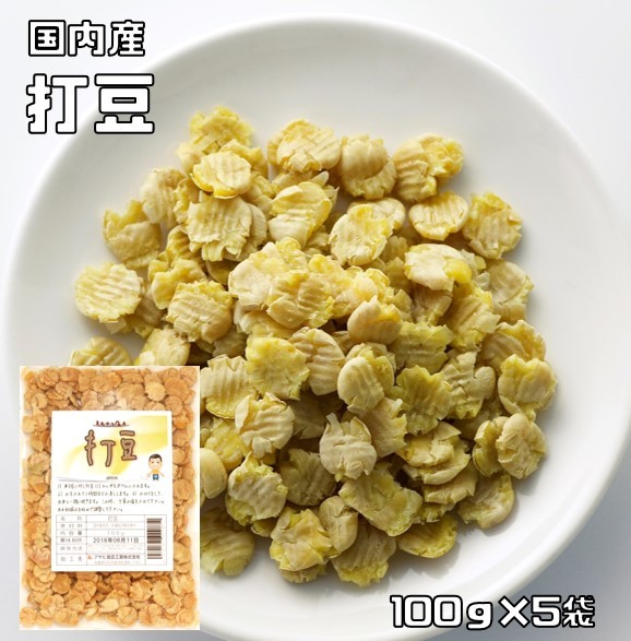 | | 規格 | 100g×5袋 | | 商品説明 | 国産の大豆を使い丁寧に打豆に加工しました。打豆は、生の大豆を潰して乾燥させたものです。福井県や新潟県、山形県など雪の多い日本海側で受け継がれてきた保存食で、冬の間の貴重な栄養源として昔から食べられてきました。潰してあるので水の吸収が早く、乾燥豆のように一晩かけて水で戻しておく必要がありません。また潰れていることから加熱時間も短くて済む打ち豆は、忙しい方にもおすすめの大豆です。 | | 原材料 | 大豆(国産 遺伝子組み換えでない) | | 保存方法 | 直射日光を避け常温で保存してください。 | | 賞味期限 | 製造から150日 | | 調理例、用途 | 1)米3合に対し打豆1/2カップをボウルに入れます。2)水を入れて1時間ほど水戻しします。3)水切りをして、お米と一緒に炊きます。この時、少量の塩を入れてください。*水加減はお好みで調整して下さい。その他、ほかの食材と一緒に煮たり、10分ほど茹でたものをサラダに加えるなど、色々な料理にお使いいただけます。地元では味噌汁の具やひじきなどの煮物に加えたり、なますなどの酢の物や炊き込みごはんに使われています。 | | 配送方法 | 宅配便