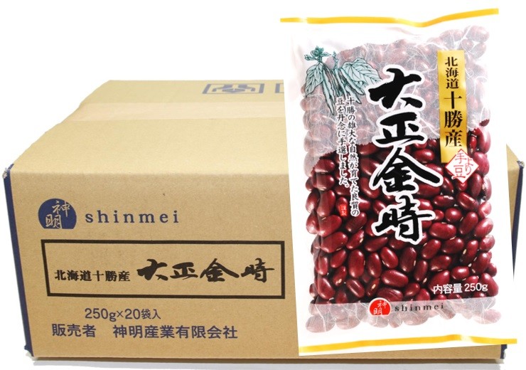 ★神明産業株式会社が製造した北海道十勝産の大正金時です。北海道産の農家が丹念に栽培した良質の金時豆をパックしました。神明産業ブランドの豆は、価格に優位性を持たせるために作られたシリーズです。中身の品質は高いので安心して販売して頂ける商品です。金時豆は、いんげんまめの代表的な種類です。北海道で栽培されているいんげんまめのうち、金時豆が約7割を占めています。金時豆は粒の形が良く、食味も優れていることから、煮豆用に最も適した豆とされ、洋風の煮込み料理にもよく用いられます。甘納豆の原料としても重要です。