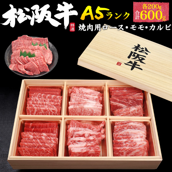 A5ランク 松坂牛 ロース モモ カルビ 焼き肉セット 合計600g3〜4人用 国産 松坂牛肉 黒毛和牛 焼肉 盛り合わせ 桐箱入り 熨斗対応可能 贈答用 肉ギフト 冷凍配送