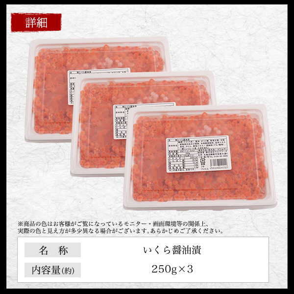 鮭いくら 醤油漬け チャム イクラ 約250g×3パック 北海道加工 いくら醤油漬け 高級食材 海鮮 正月 おせち料理 御祝 いくら丼 ちらし寿司 ご家庭用 冷凍配送