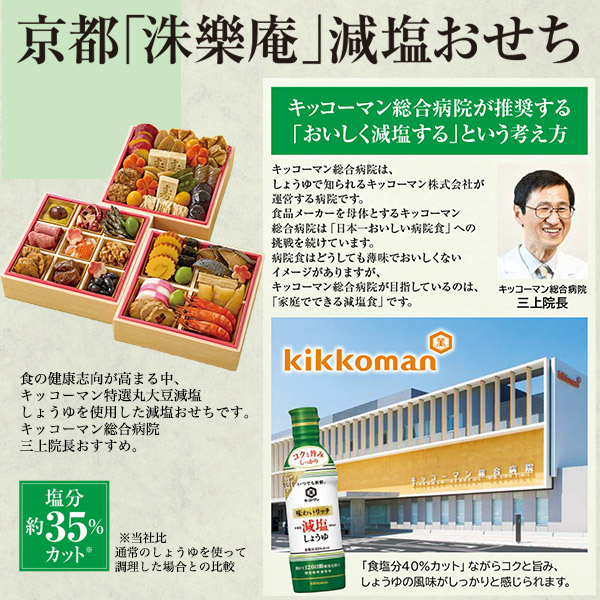 食の健康志向が高まる中、キッコーマン特選丸大豆減塩しょうゆを使用した減塩おせちです。