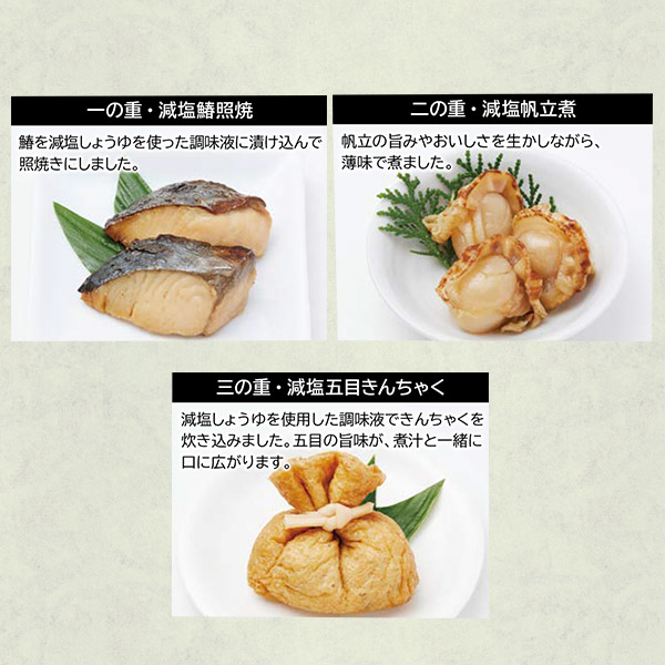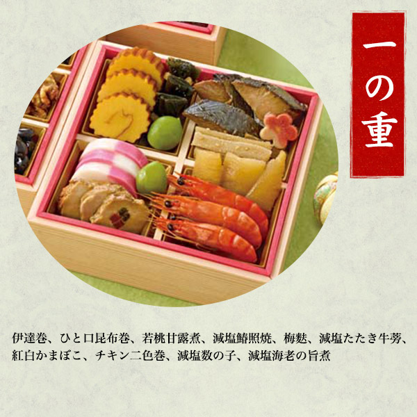 伊達巻、ひと口昆布巻、若桃甘露煮、減塩鰆照焼、梅麩、減塩たたき牛蒡、紅白かまぼこ、チキン二色巻、減塩数の子、減塩海老の旨煮