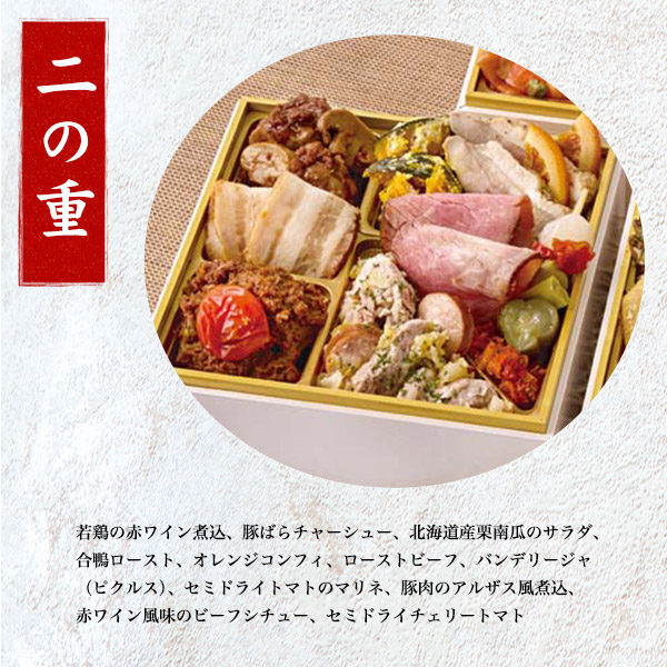 伊達巻、クランベリーくるみ、田作り、鳴門金時芋きんとん、渋皮栗甘露煮、北海道産黒豆、北海道産昆布の松前漬、数の子、雪降り和牛尾花沢のしぐれ煮、青実山椒、かまぼこ(赤)、かまぼこ(白)、焼き海老、紅白なます、いくら醤油漬、九条葱の玉子焼、若桃甘露煮