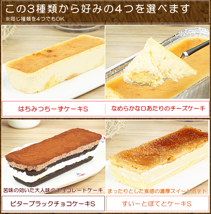 あの黒すぎるシェフとして各メディアで大活躍のたいめいけん三代目・茂出木シェフ。そんな彼が監修した3種類のスイーツ。はちみつちーずケーキS、ビターブラックチョコケーキS、すいーとぽてとケーキS。こちらの3種類のスイーツからお好みのものを4つお選びいただけます。
