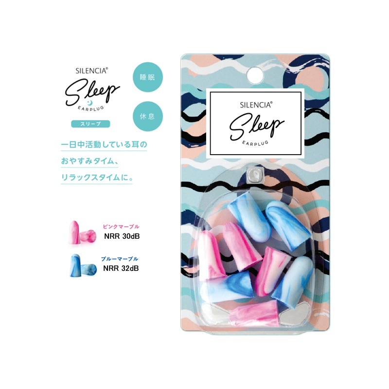 ほどよく遮音するスモールサイズ(ピンクマーブル)としっかり遮音するレギュラーサイズ(ブルーマーブル)の2タイプが入っています。ソフトな着け心地で、就寝時の使用に最適な耳せんです。