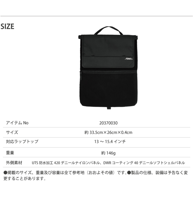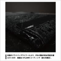 ・外側素材:UTS防水加工420デニールナイロンパネル、DWRコーティング40デニールソフトシェルパネル