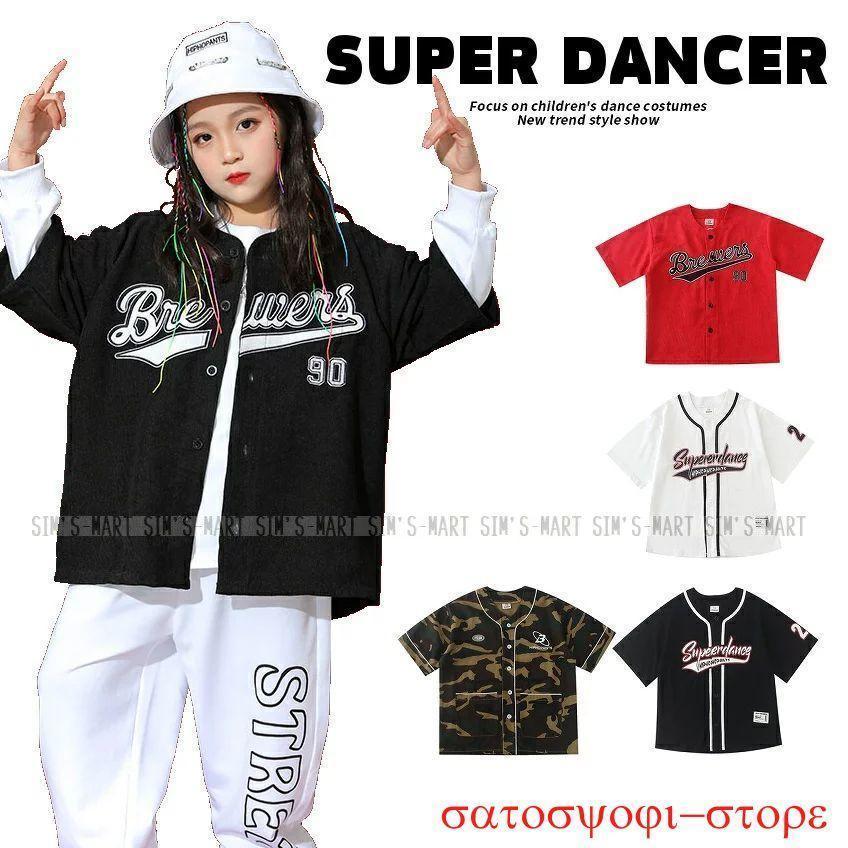 ベースボールシャツ ダンス衣装 キッズ ヒップホップ キッズダンス衣装 派手ス シャツ 男の子 ガールズ 韓国 K-POP 黒 赤 白 迷彩