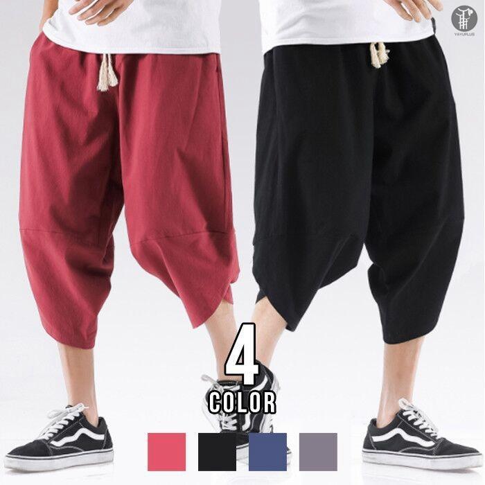 綿麻風サルエルパンツ ワイドパンツ メンズ 七分丈 涼しい 無地 ガウチョパンツ サルエル パンツ 夏 ウエストゴム 春夏 ボトムス