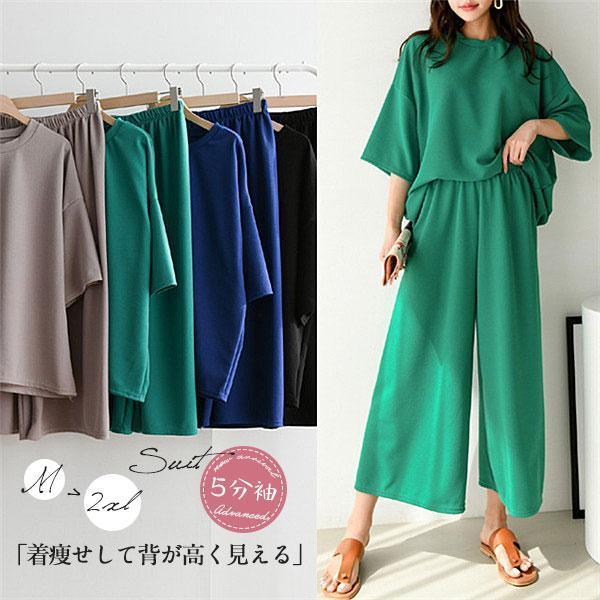 セットアップ レディース 2点セット ジャージ 上下セット ルームウェア ス 半袖 9分丈 ゆったり ワイドパンツ 無地 カジュアル 快適