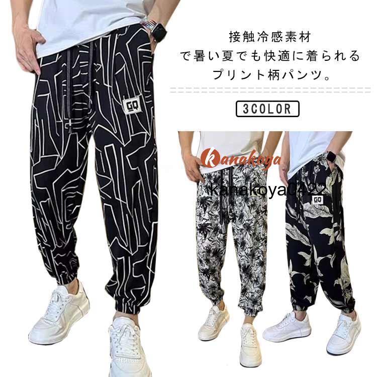 プリント柄 接触冷感 メンズ 大きいサイズ 薄手 夏 サルエルパンツ 長ズボン ロングパンツ 総柄 イージーパンツ アイスシルクパンツ 裾ゴム ウエ