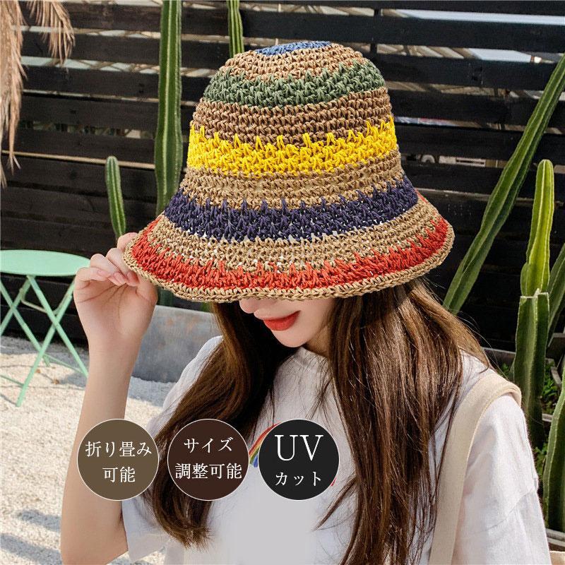 麦わら帽子 レディース uv 帽子 折り畳み 春夏 涼しい 大きめ ハット おしゃれ 天然素材 虹 UVカット帽子 旅行 キャップ 日焼け対策