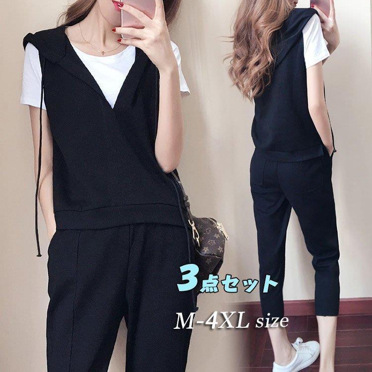 セットアップ 夏 レディース パンツ フォーマル 入学式 卒業式 パーカー テーパードパンツ 3点セット 上下セット Tシャツ コーデ ロングパンツ