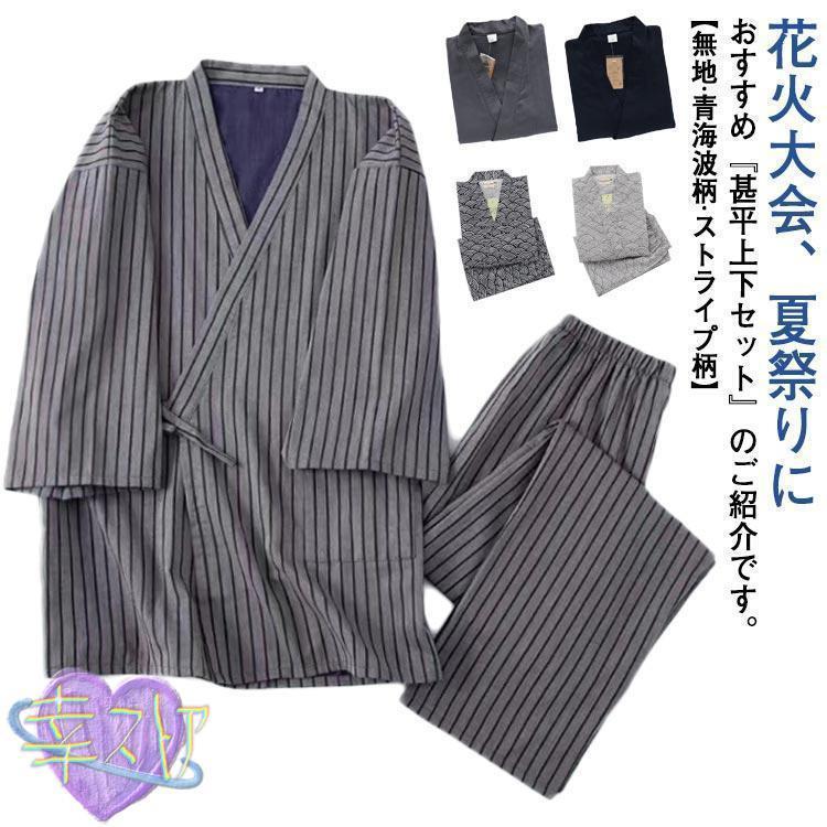 甚平 浴衣 メンズ 綿 麻 パジャマ 上下セット 七分袖 長ズボン 春 夏 前開き 無地 青海波柄 ストライプ柄 おしゃれ 作務衣 和服 じんべい 花