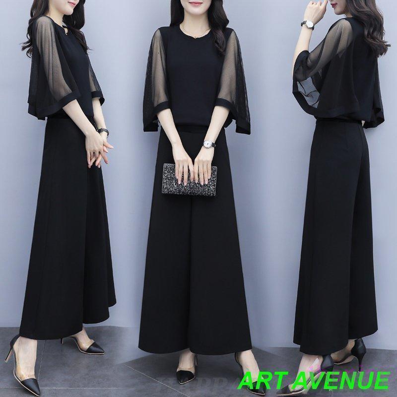 [] かっこいいパンツドレス 袖あり セパレート パーティードレス 結婚式 お呼ばれ ドレス 服装 セットアップ レディース パンツスーツ ワイドパンツ ドレス 大きいサイズ 五分袖 半袖 黒 ゆったり 体型カバー エレガント きれいめ 透け感 シースルー 女性 20代 30代 40代 50代 3L 4L 入学式 卒業式 入園式 卒園式 謝恩会 懇親会 ブラック