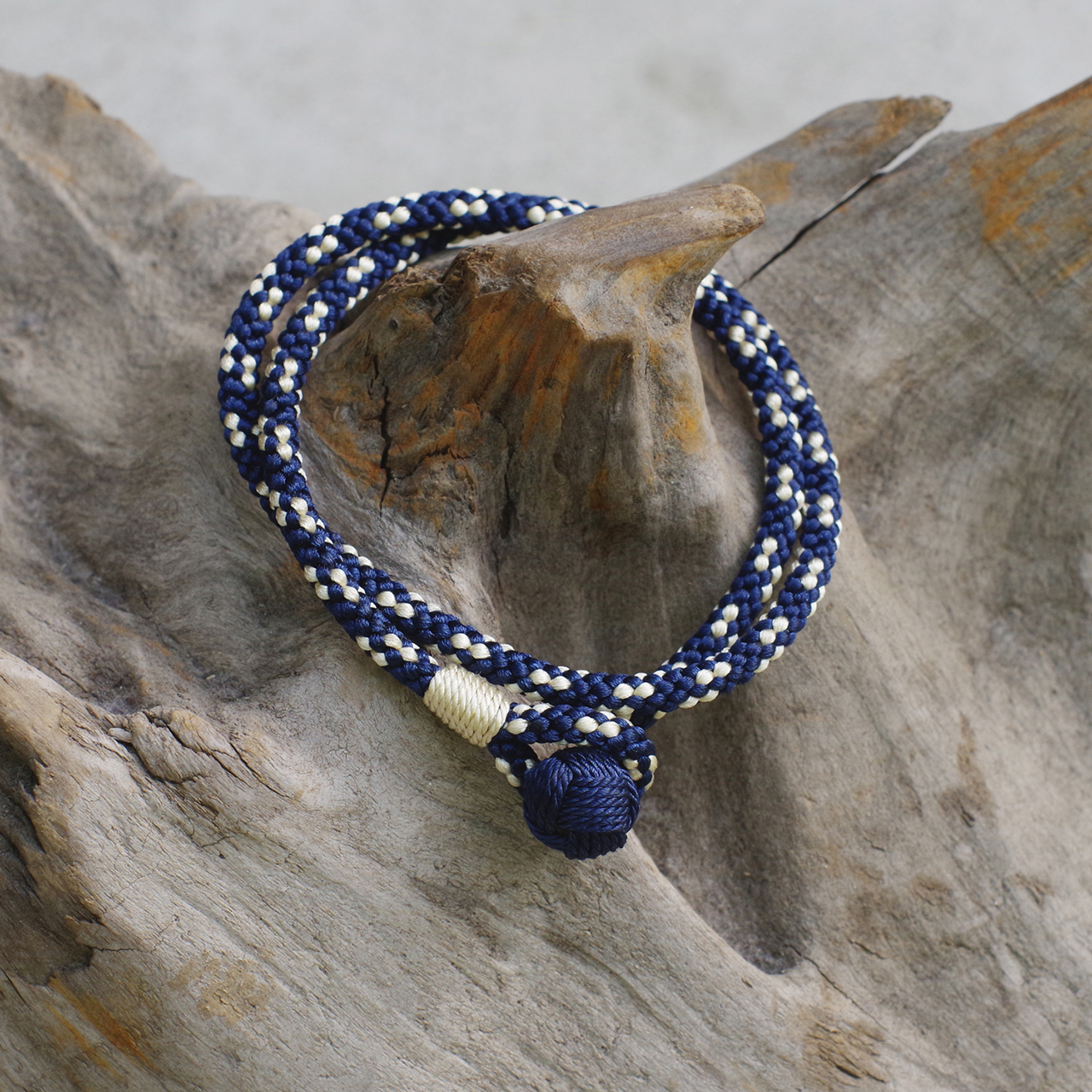 京都の昇苑くみひもに別注をかけたTABITOTEオリジナルカラーの二重巻きブレスレットです。海と砂浜をイメージしたネイビー×サンドベージュの配色は、デニムやネイビーコーデに相性抜群。日常的にご着用いただけるカラーリングです。