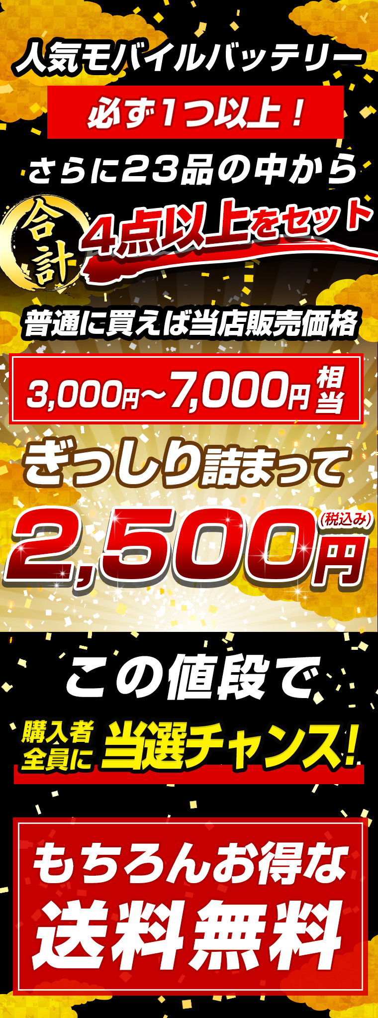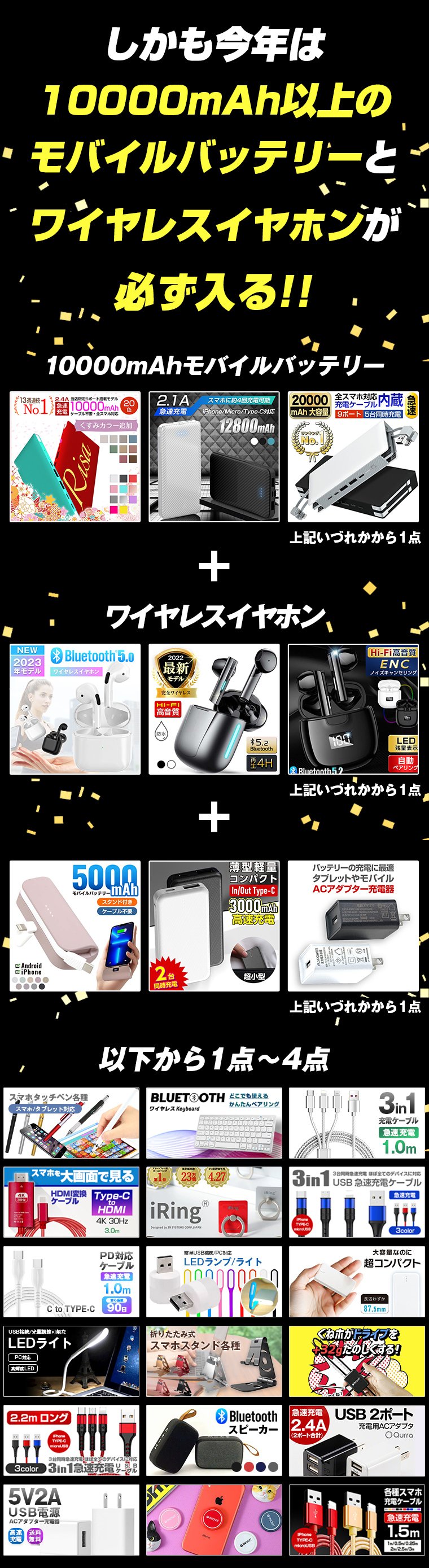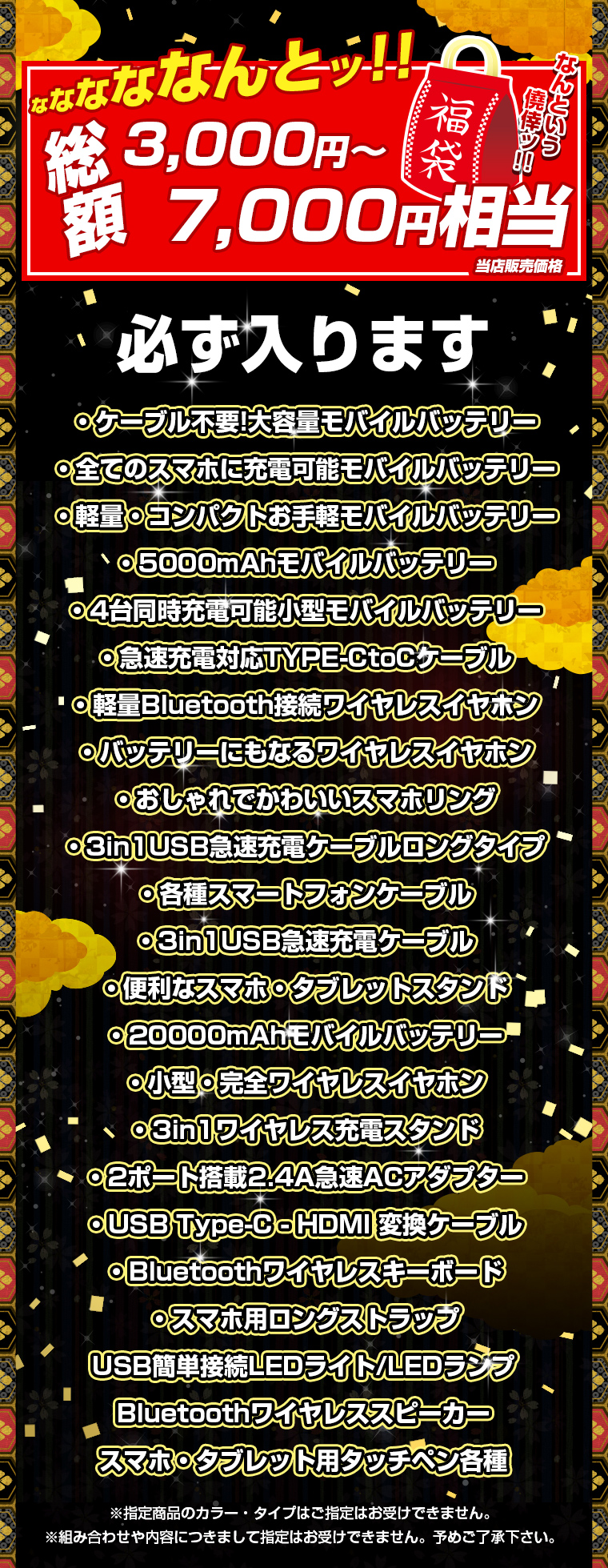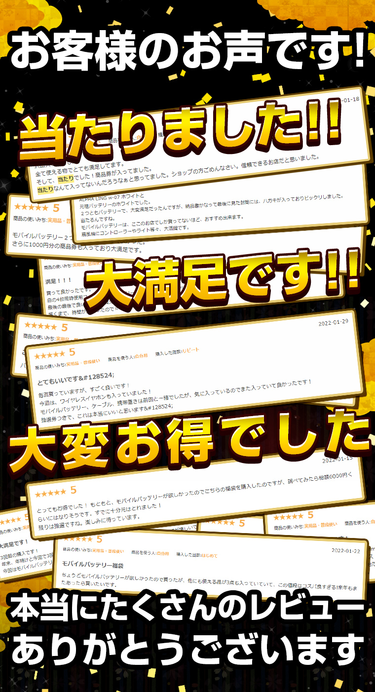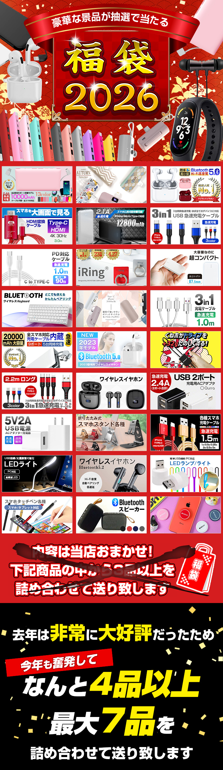 モバイルバッテリーが必ず入るお得な福袋となっております。