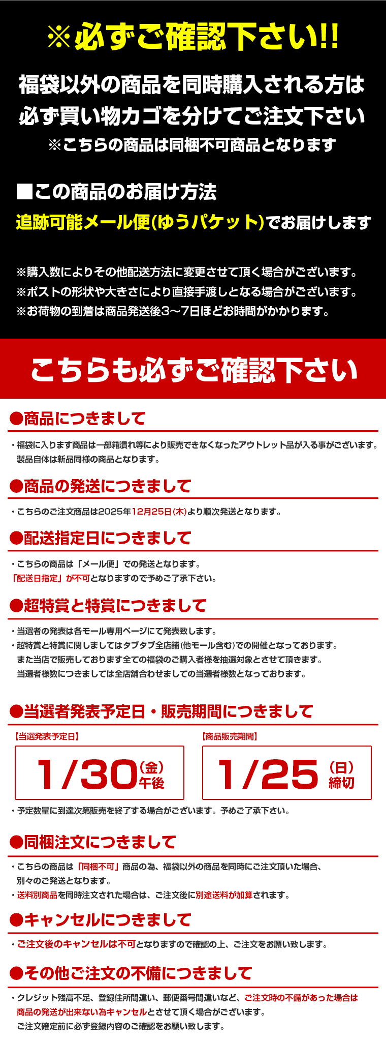 こちらの商品は「同梱不可」商品の為、福袋以外の商品を同時にご注文頂いた場合、別々のご発送となります。