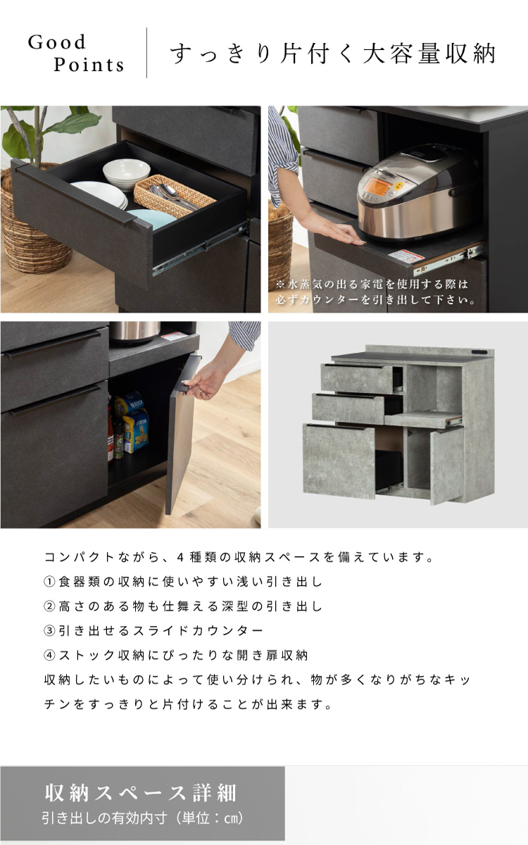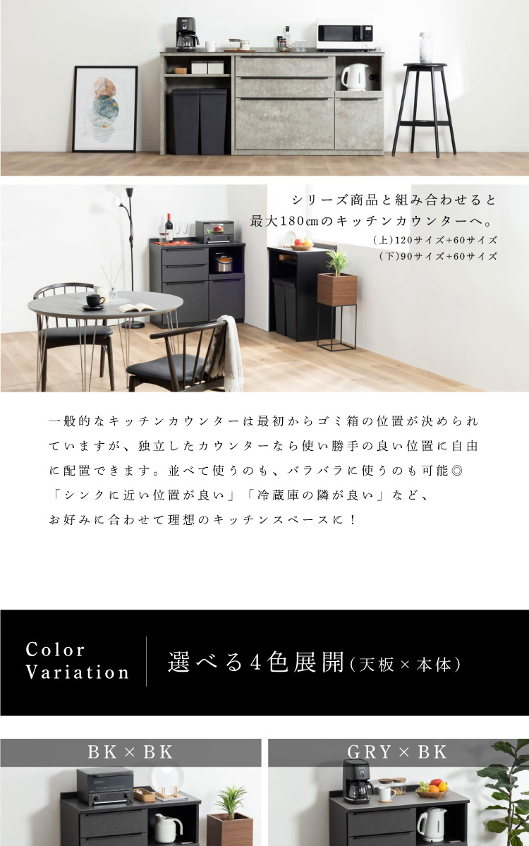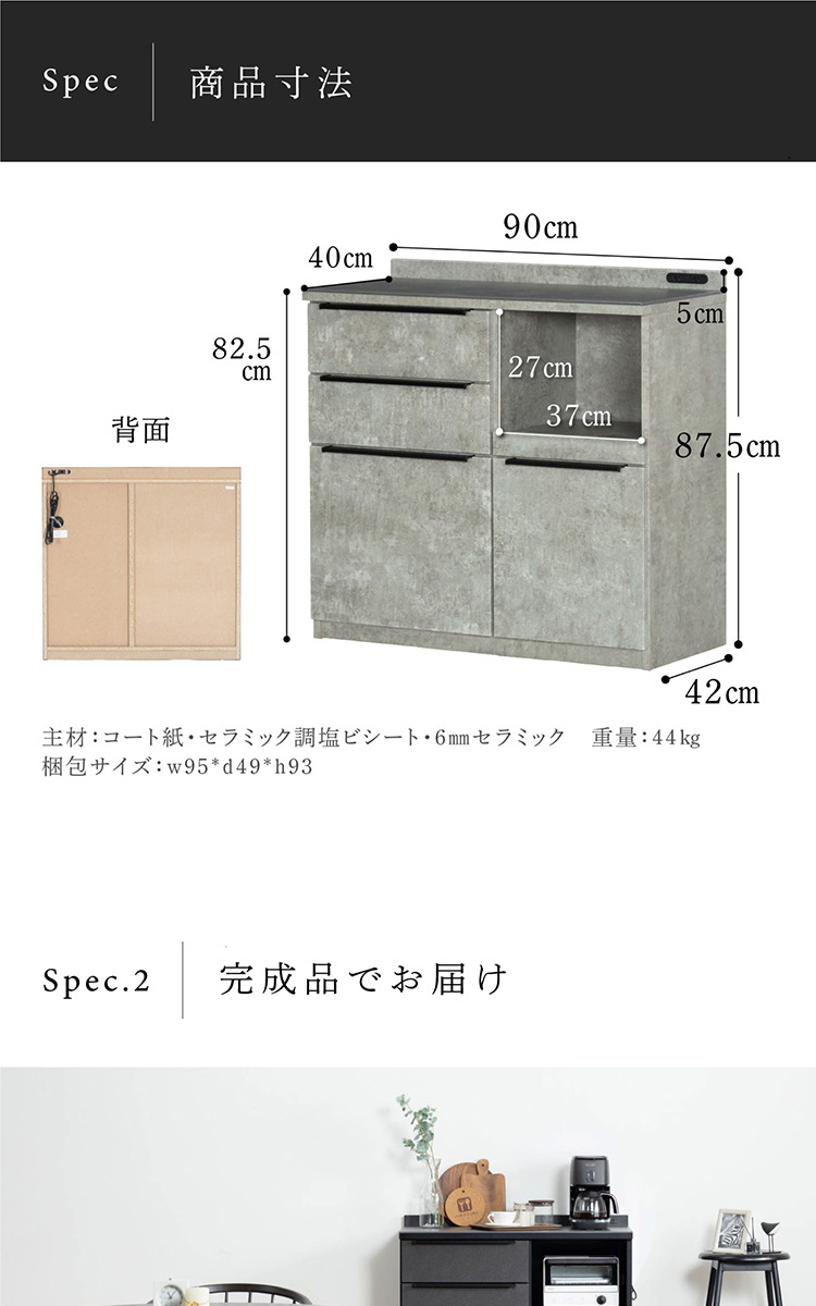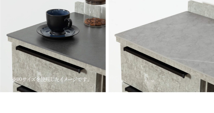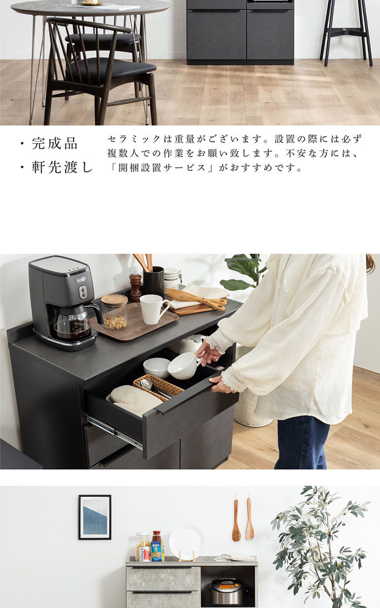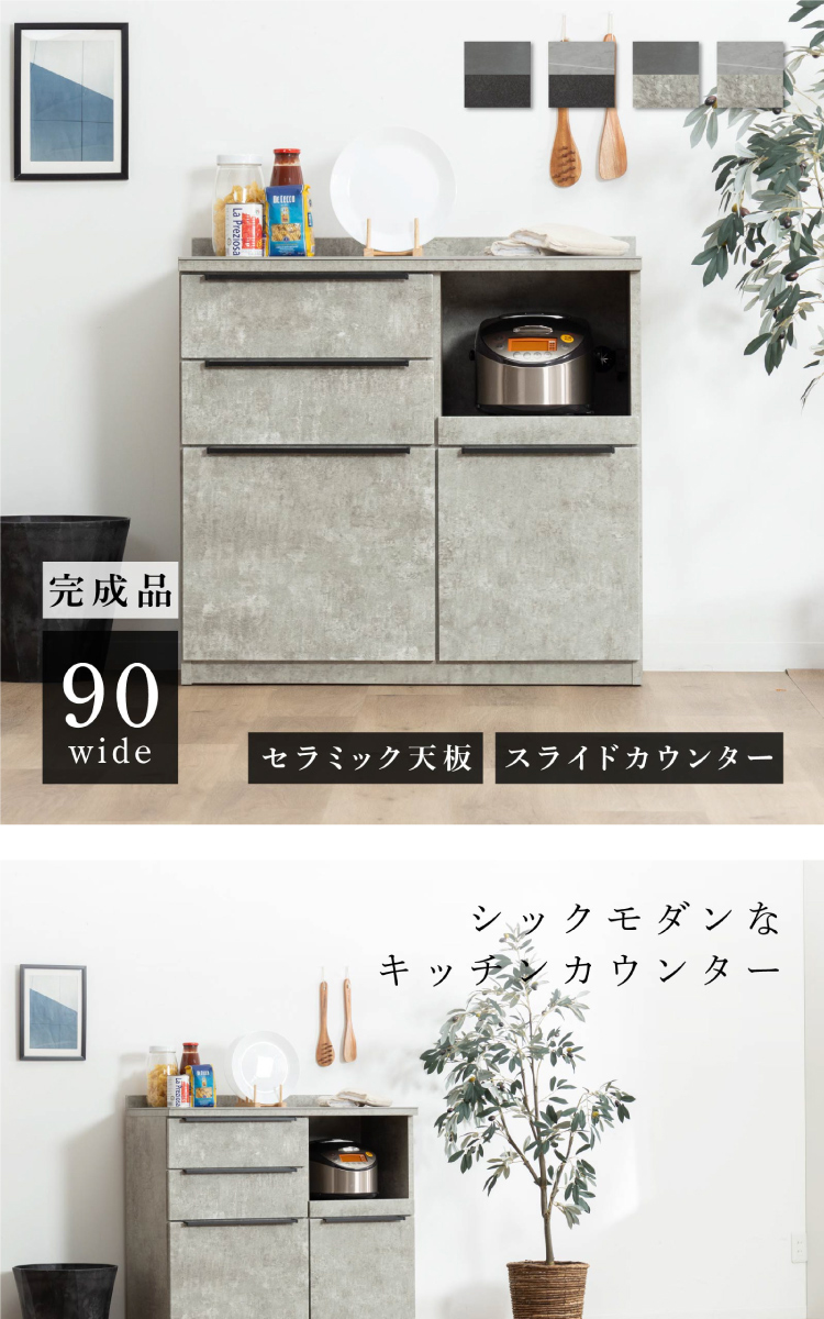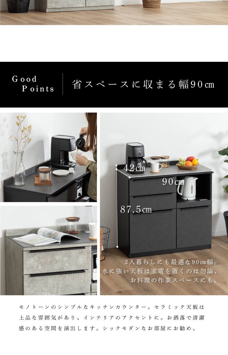 キッチンカウンター 90 幅 キッチン 作業台 セラミック ブラック レンジ台 完成品 スリム 食器棚 キッチンボード ロータイプ キッチン収納 炊飯器 引き出し
