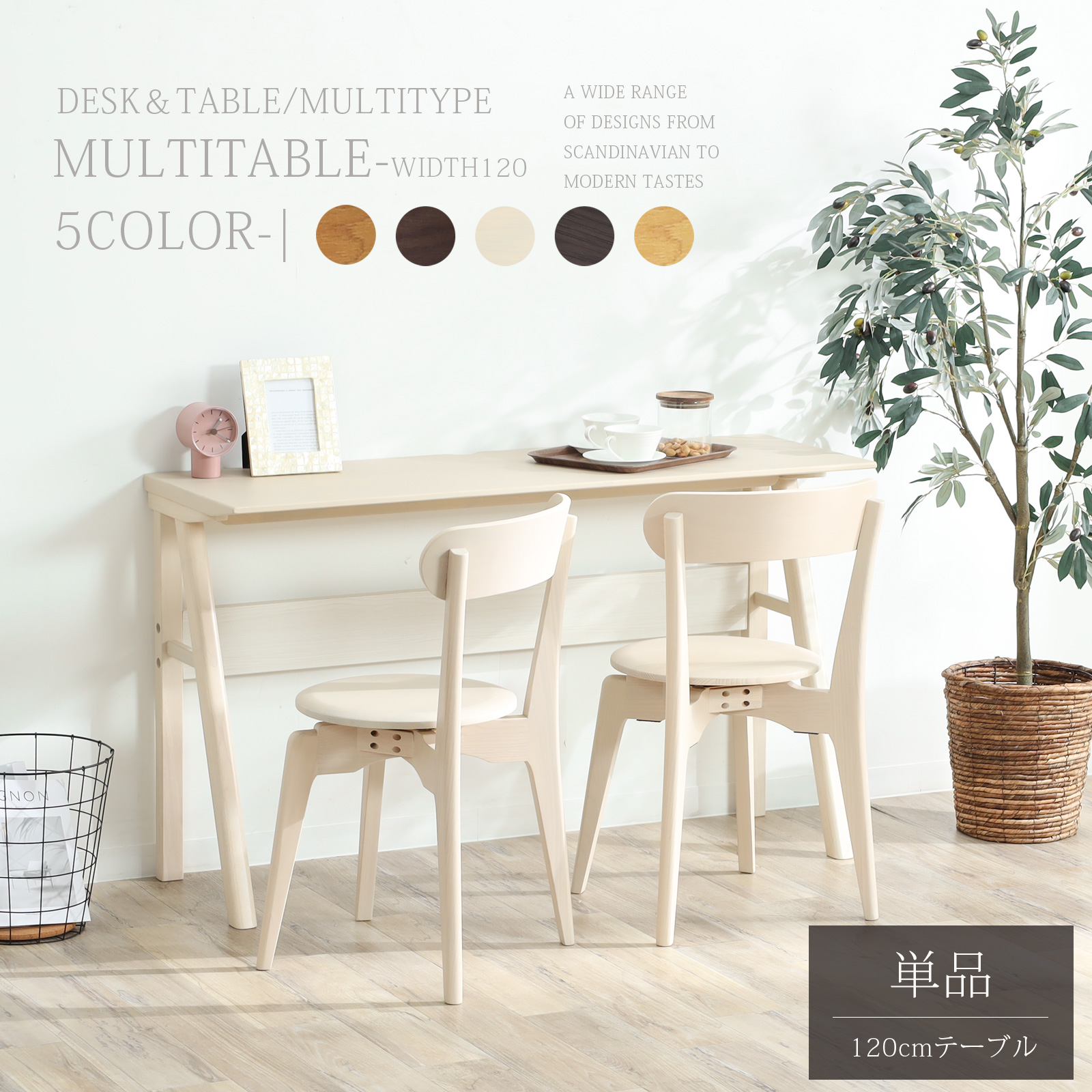 ナチュラルな印象が魅力の カウンターテーブル。幅 120 cm でコンパクトながら、ダイニングテーブル としても活躍します。5色展開で、お部屋の雰囲気に合わせて選べるのも嬉しいポイント。シンプルな設計で狭い空間にも置きやすく、組み立ても簡単。仕事・勉強机としても使え、毎日の暮らしを快適に彩るアイテムです。