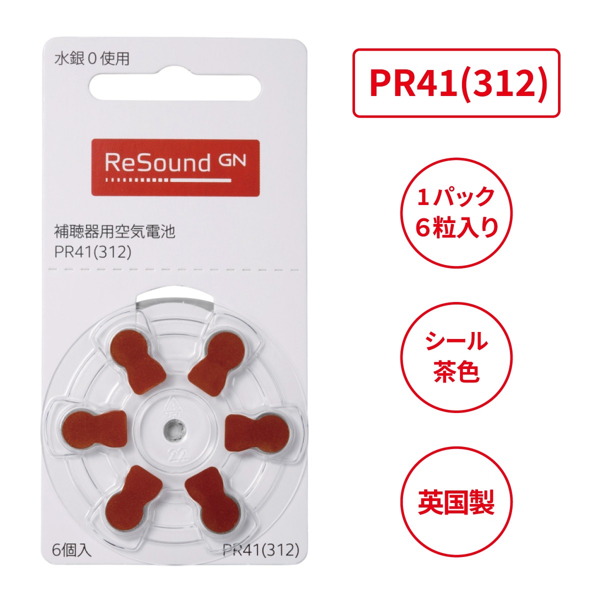 GNリサウンド/PR41(312)/Resound/補聴器電池/補聴器用空気電池/6粒1パック