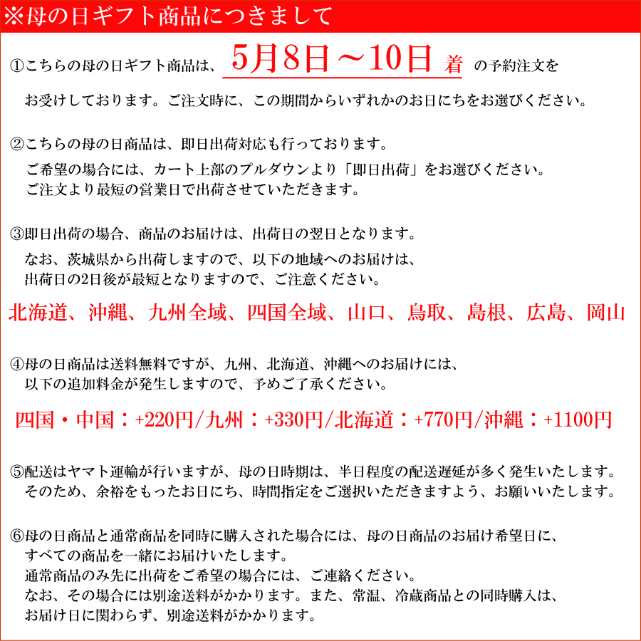 こちらの商品は、母の日専用の掛け紙、カードをお付けしております。ご不要の場合には、カート上部のプルダウンより「不要」をご選択ください。