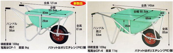 | 幅狭深型58リットル 一輪車 | 深型113リットル 一輪車 | | ●バケットが幅狭・深型なので狭い場所でも安定して運搬できます。 | ●バケットが深くて大きいので飼料の運搬や野菜の収穫に最適です。 | |