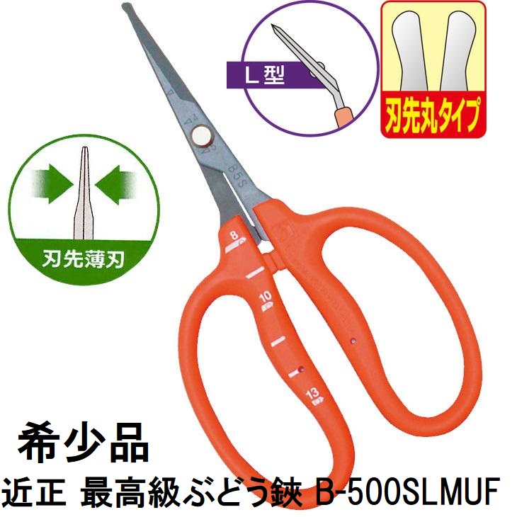 (最高級 希少品) 近正 ぶどう鋏 B-500SLMUF L型 曲刃 ステンレス・フッ素加工 刃先丸タイプ 刃先薄刃 ぶどう手入れ鋏 目盛付き チカマサ (ネコポス)