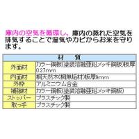 | 天井の湿気除去ファンが庫内の通気性を高め、庫内の蒸れを防ぎます。外面材のカラー鋼板を使用しているので、ネズミの害に対して安心です。 | 材 質 | | 外面材 | カラー鋼板(塗装溶融亜鉛メッキ鋼板)板厚0.27mm | | 内面材 | 桐天然木(桐無垢材)板厚9mm | | 外枠 | アルミニウム合金 | | 補強材 | カラー鋼板(塗装溶融亜鉛メッキ鋼板) | | ストッパー | プラスチック製 | | 取っ手 | プラスチック製 | | |
