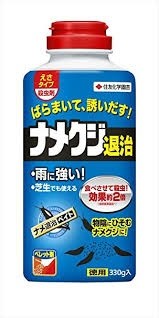 「ナメ退治 ベイト 330g」は、ばらまいて誘い出す、えさタイプの不快害虫剤です。あらかじめまいておくだけで、物かげにひそんでいるイヤなナメクジ、カタツムリを誘い出し、食べさせて退治します。