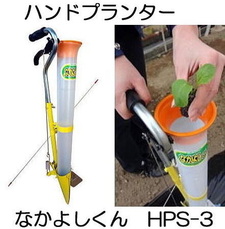 ハンドプランターの特長 ■腰を屈めずに作物を植付けることができます。 ■黒大豆やレタスの移植、タマネギの補植など 様々な作物の植付けに最適です。 ■本体は1.3kgと軽量、またマーカーで一定間隔 に植え付けできるので作業がはかどります。 ■苗の条件 (1)セルトレイなどで育苗した土付き苗 (2)苗の土部が筒の内径(直径50mm)以下 注意:本機は必ず耕耘した圃場でご使用ください。 土が固い状態では故障する場合があります。 |
