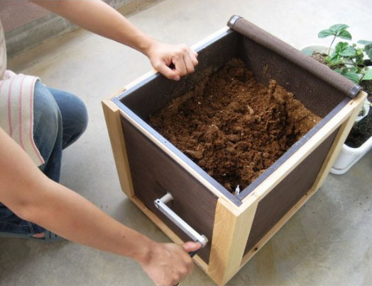 オリジナルの資材「ソルビオ」に含まれる微生物の働きで、生ごみを水とCo2に分解し、約1/10以下に減量。電気を使わないエコな生ごみ処理機です。