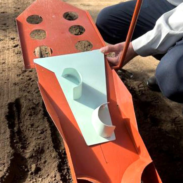ひっぱりくんHP-16型にこちらのLP350円弧アタッチを取り付けることで、株間30cmのロングピッチチェーンポットLP353-30の安定した植付を可能にします。左右の円弧の中心にポットを通して使用します。