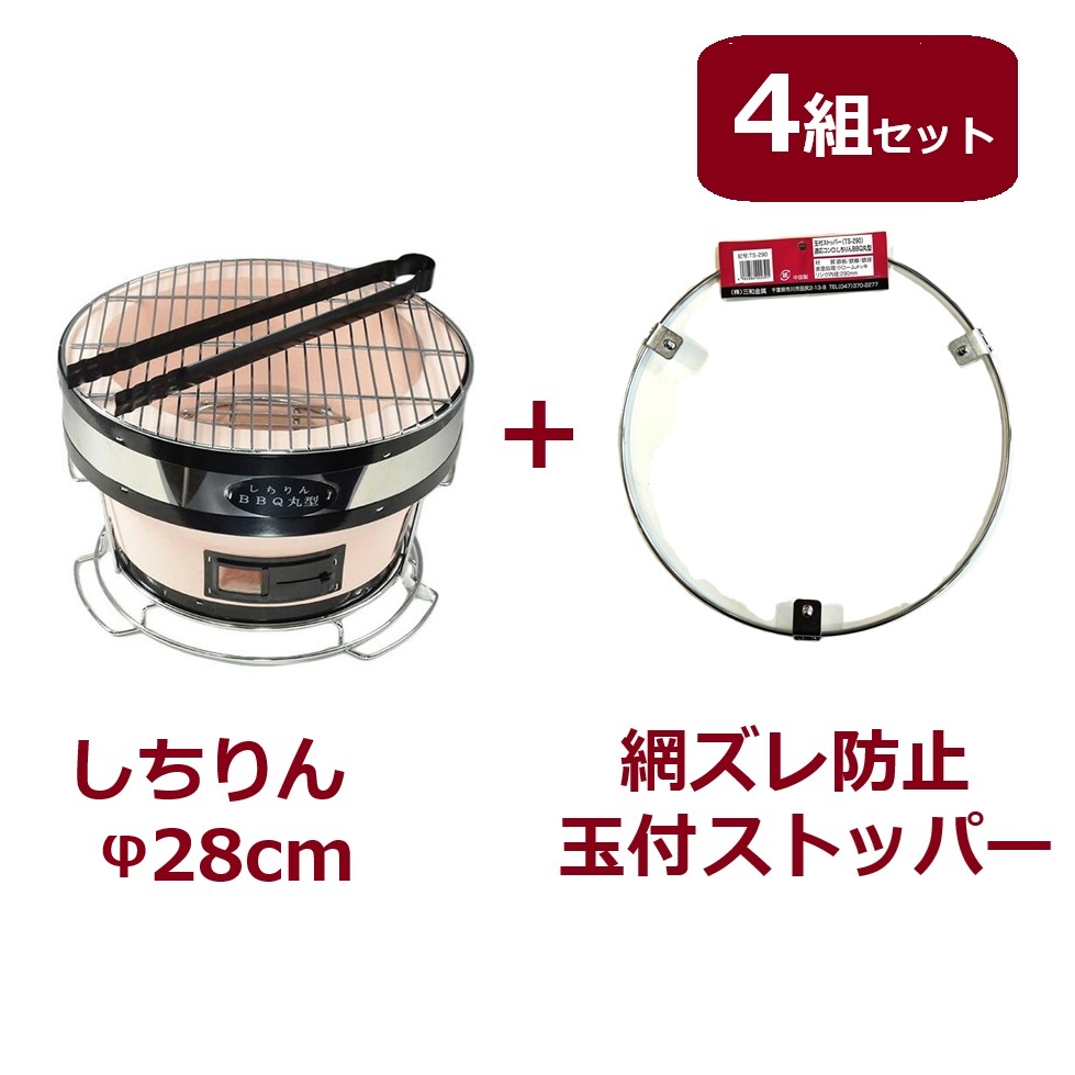 (網ズレ防止金具4組セット) しちりん×4 丸型 直径28cm 高さ17cm (火バサミ、敷台、丸アミ、取っ手付き) + 玉付ストッパー×4 TS290 珪藻土 七輪 BBQ コンロ zm