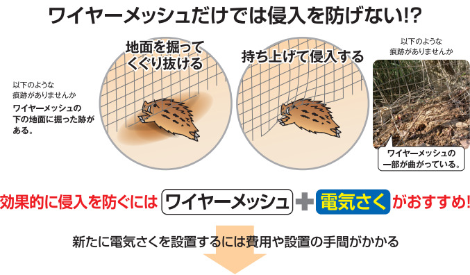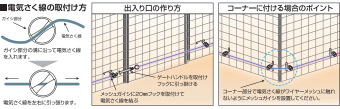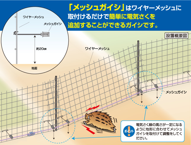 ワイヤーメッシュに取り付けるだけで簡単に電気柵を追加することができます。