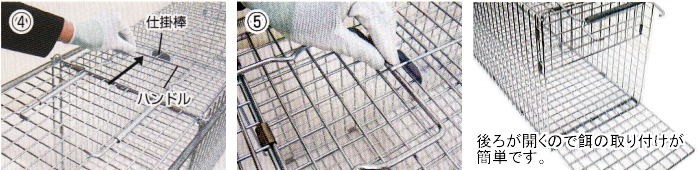 後ろ扉を開けて、餌フックに餌を取り付け扉を閉めます。
