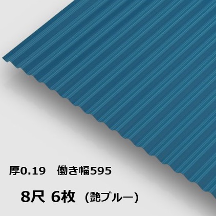 6枚単位 波板 8尺 艶ブルー 丸波0.19mm厚 幅650mm(有効幅595) 約2438mm 梱包重量18.7kg カラー亜鉛鉄板 塗装溶融めっき鋼板 トタン板 青