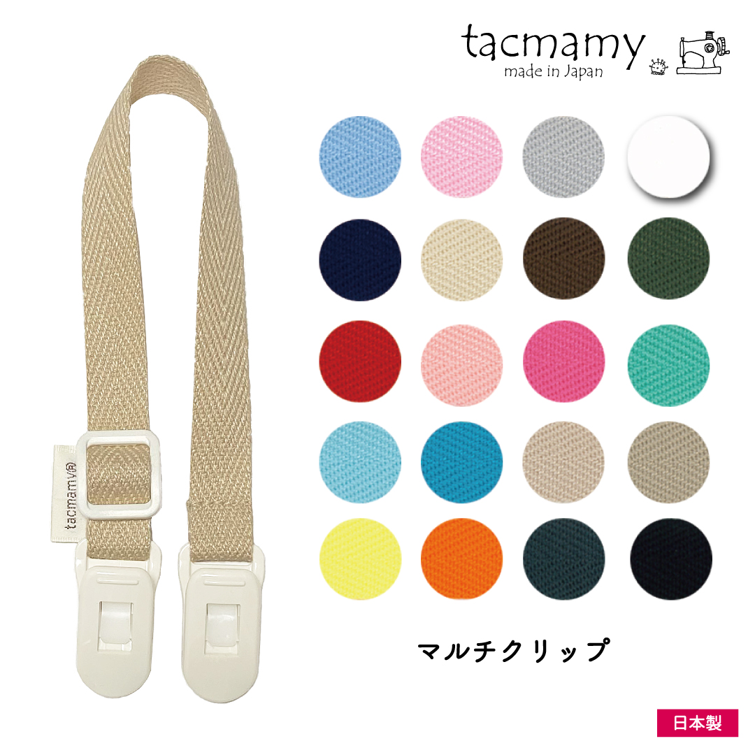 日本製のシンプルなマルチクリップです。長さ調整アジャスター付で、Sサイズは21.5cmから32cmまで、Mサイズは29cm〜47cmまで長さの調整が可能です♪