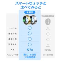 また、指輪の形はオシャレで装着感が抜群、一日中付けても負担にならず、落ちる心配もないので、ファッションの一部として使用できるように大きさ、重さ、サイズにこだわり、よりスマートに健康管理ができます。 ???????