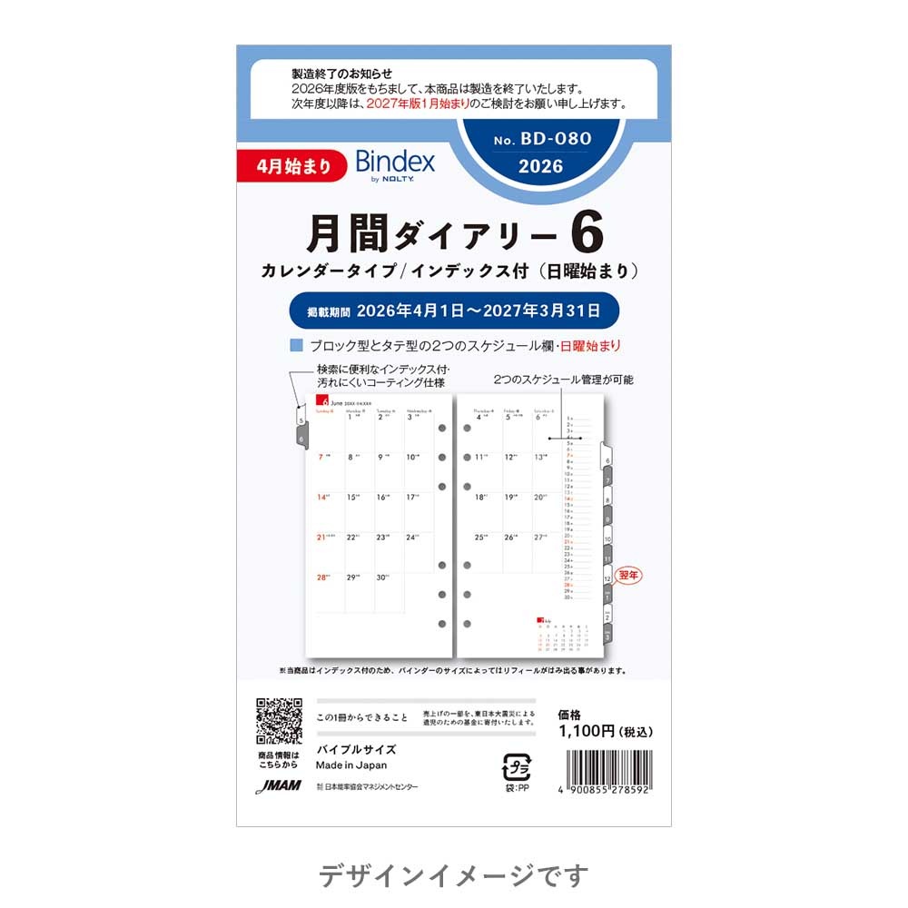 [Bindex] 2026年4月始まり 月間ダイアリー カレンダータイプ インデックス付 (日曜始まり) BD080 月間6
