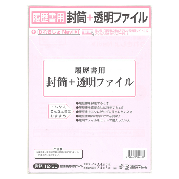 [日本法令] 履歴書用封筒+透明ファイル 労務12-35