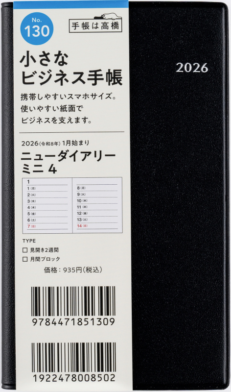 高橋書店 2026年1月始まり ニューダイアリーミニ4 No.130