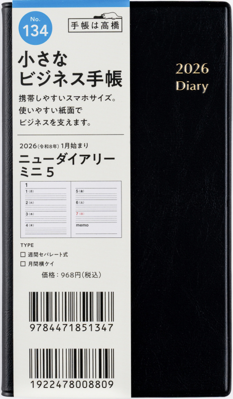 高橋書店 2026年1月始まり ニューダイアリーミニ5 No.134