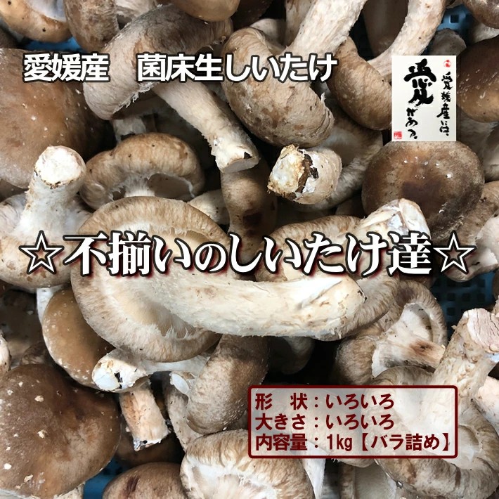 愛媛県産の菌床生しいたけが、小さいものから大きいものまで、大きさ無選別でたっぷり1キロ入っています。