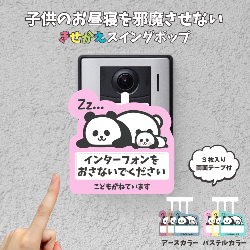 赤ちゃんには背中にはスイッチがついてると言われます。苦労してやっとお昼寝させられたと思ったら、『ピンポーン』とインターフォンがなって振り出しに…。子育てに忙しいパパママを助ける、小さい赤ちゃんやお子様のお昼寝を邪魔させない“お昼寝中です”スイングポップです。 使い方は簡単。インターフォンに貼っておくだけ。宅配業者・セールス・身内やご近所さんに 子供がお昼寝中のため、インターフォンを押さないでくださいと伝えることができます。出産祝いやハーフバースデー・お食い初めやお宮参りなどの贈り物としても喜ばれます。スイングポップは防水・撥水に優れるため、雨の日など天候の悪い日に貼っておいても問題ありません。またシールは弱粘着のため、剥がして別のシールを貼ることもできます。可愛らしいパンダは子供だけでなく、若者からお年寄りまで幅広い年齢の方に親しまれるキャラクターになっています。日々忙しい人をきせかえスイングポップの遊び心で笑顔にします。こんな商品いかがでしょうか?