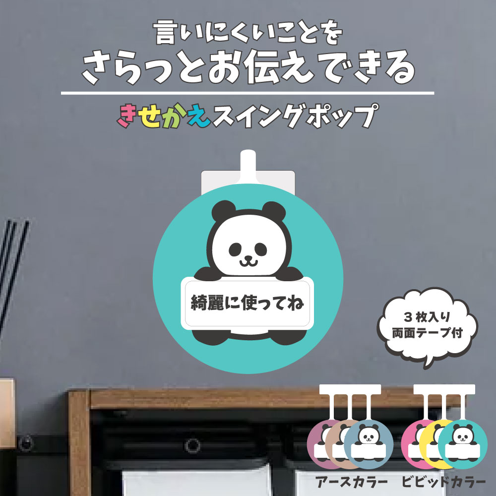 職場で言いにくいことをサラッと伝えられるスイングポップです。節電してほしい。トイレは座って使ってほしい。用具などなくなったら補充してほしい。など直接だと嫌味っぽく聞こえてしまうことをスイングポップの遊び心でサラッと伝えられます。また職場だけでなく、自宅でも同様の使い方ができます。スイングポップは防水・撥水に優れるため、雨の日など天候の悪い日に貼っておいても問題ありません。またシールは弱粘着のため、剥がして別のシールを貼ることもできます。可愛らしいパンダは子供だけでなく、若者からお年寄りまで幅広い年齢の方に親しまれるキャラクターになっています。日々忙しい人をきせかえスイングポップの遊び心で笑顔にします。
