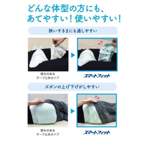 前後のウェストギャザーで背モレ・腹モレを防止。足まわりの二つのギャザーで流れ・伝いモレを防止。
