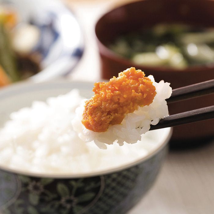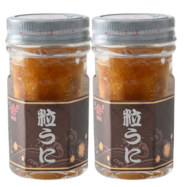 アルコールに漬けた瓶詰めうには、明治初期に山口県下関市の六連島での酒席で、小鉢のうにに酒がかかり、それがおいしかったことに端を発するといわれており、下関は「粒うにの発祥の地」と呼ばれています。下関の伝統的なうに加工の技術を駆使して作りあげた、しっとりとした質感です。うにに塩とアルコールを加え調合し、まろやかな甘さが引き立つ茶ラベル粒うにです。