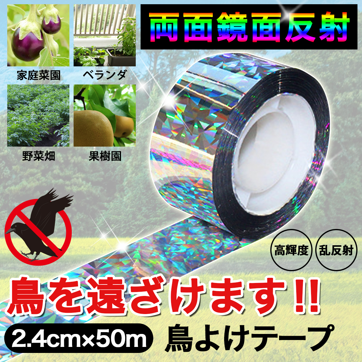 光に当たってキラキラと虹色の反射を利用してる防鳥ホログラムテープです。お好きな長さを切って、畑のまわりや、果実のそばに結んで、光と風の揺れで鳥よけ対策に。