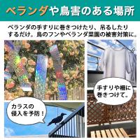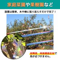 この防鳥テープは糊なしタイプで、両面高反射、表面にくっついて清潔できなくなる心配もありません。取り付けの時に、木に結ぶだけで簡単に設置できる。