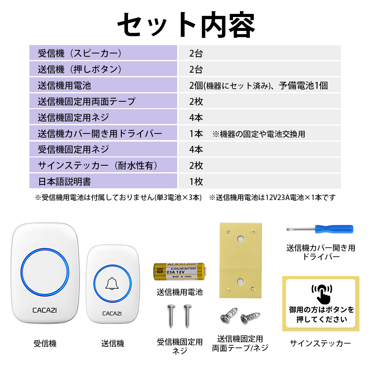 受信機は電池式で、送信機をドアフレームに固定しボタンを押すだけでチャイムが流れます!